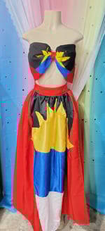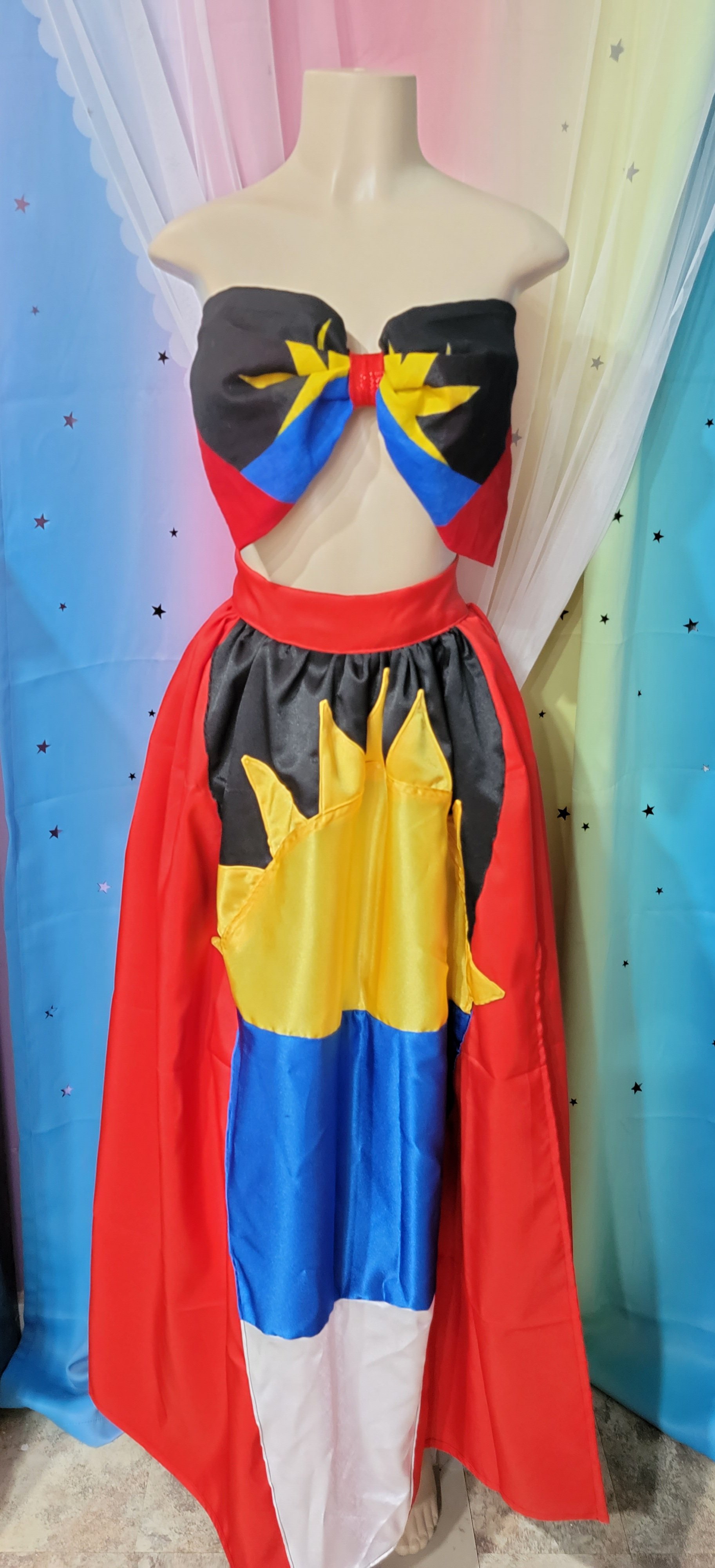 This beautiful two piece set displays the flag of the island Antigua. This two piece beauty is made with individual fabric pieces, carefully cut and sewn together to recreate this national island flag. Each detail cut carefully and placed to recreate the radiant island flag. Bandeau top makes a fun and flirty pair to this lovely skirt. This dress can be made to reflect other countries as well per request. Prices may vary based off of complexity of flag, simply message us. Dress can be worn for various occasions. Show your pride in style in this lovely piece.