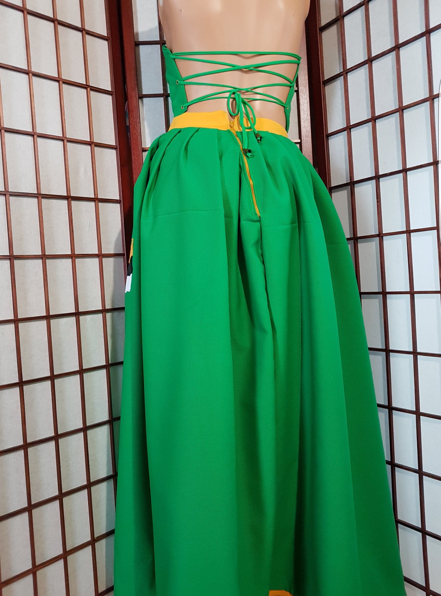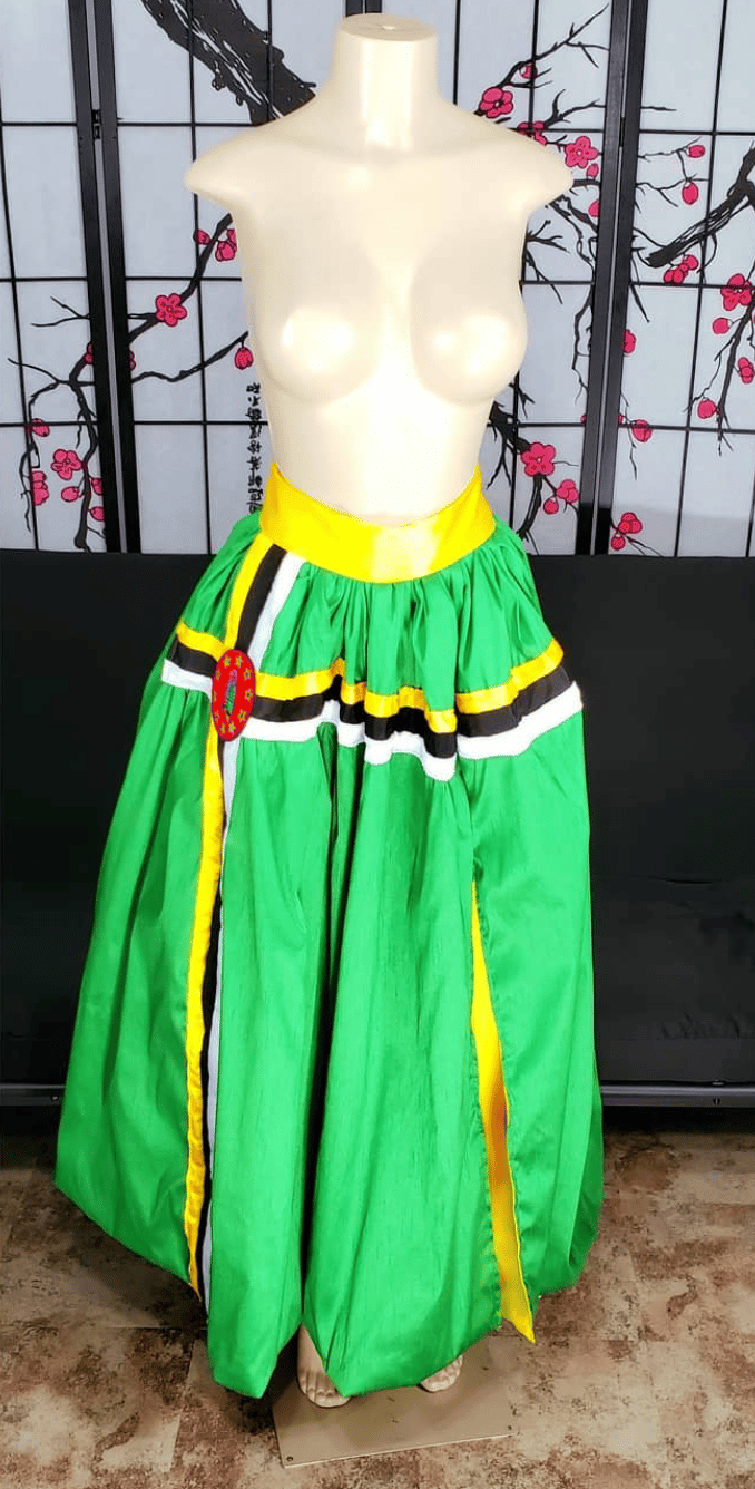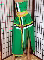 This lovely two piece set displays the the beautiful yellow, green, black and white colors from the flag of the island Dominica. This two piece beauty is made with individual fabric pieces carefully cut and sewn together to recreate this national island flag. Dress is very detailed with the coat of arms embroidered with several stitches. This dress can be made to reflect other countries as well per request, prices may vary based off of complexity of the flag, simply message us. Dress can be worn for various occasions. Show your pride and style in this lovely piece.