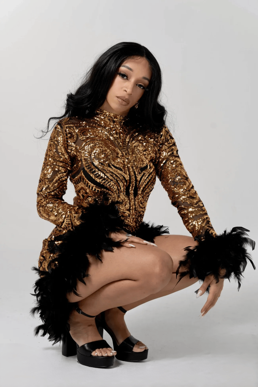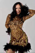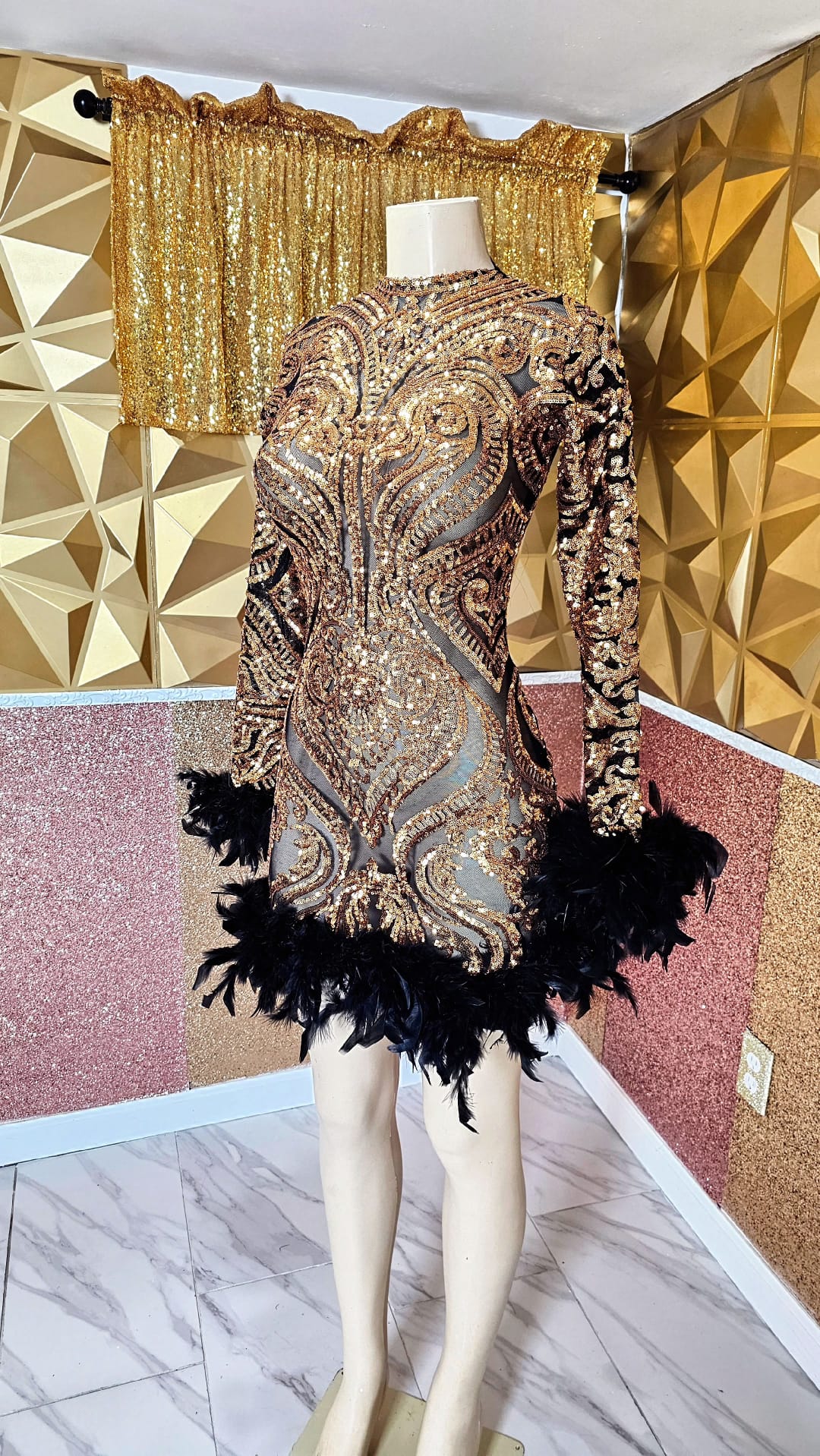 This beauty makes the perfect party dress. Show off those legs and curves in this fun and flirty piece. Dress is made from a detailed gold sequin garment with black feather embellishment around the wrist and bottom. Please keep in mind that this dress contains sheer sections, lining can be added per request at an additional cost. Please let us know beforehand. Dress can be worn for various events ranging from proms, red carpet galas, photo shoots, birthdays and much more.